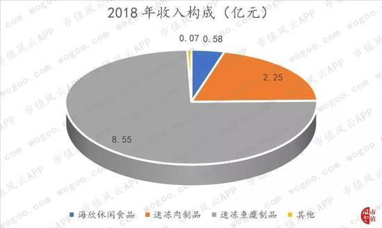 速冻鱼糜制品贡献了75%的收入,2018年入账8.55亿。其次是速冻肉制品,销售额2.25亿,占比20%。常温休闲食品收入0.58亿,占比5%。