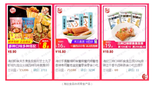 但海欣食品在产品食用场景上做了细分,有速冻火锅料产品,如鱼丸、肉丸、芝士丸、龙虾球、鳕鱼豆腐,也在行业内率先推出了常温休闲零食产品,如蟹柳、鱼豆腐、蟹黄卷、鱼板烧等。