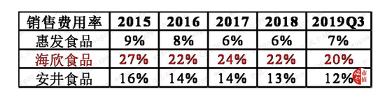 自然,海欣食品销售费用率高居三家上市速冻火锅料制品公司首位,超过20%。