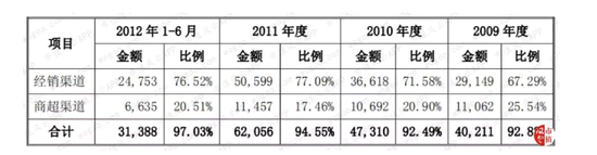在公司披露渠道销售额的招股说明书里,2011年经销渠道占比77%,商超渠道占比17%。