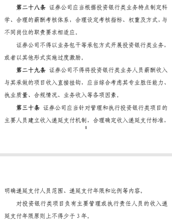 此外,《指引》指出,证券公司应当建立业务人员奖金递延支付机制,不得对奖金实行一次性发放。奖金递延发放年限原则上不得少于3年。投资银行类项目存续期不满3年的,可以根据实际存续期对奖金递延发放年限适当调整。与此同时,内部控制人员的薪酬收入也不得与单个投资银行类项目收入挂钩。
