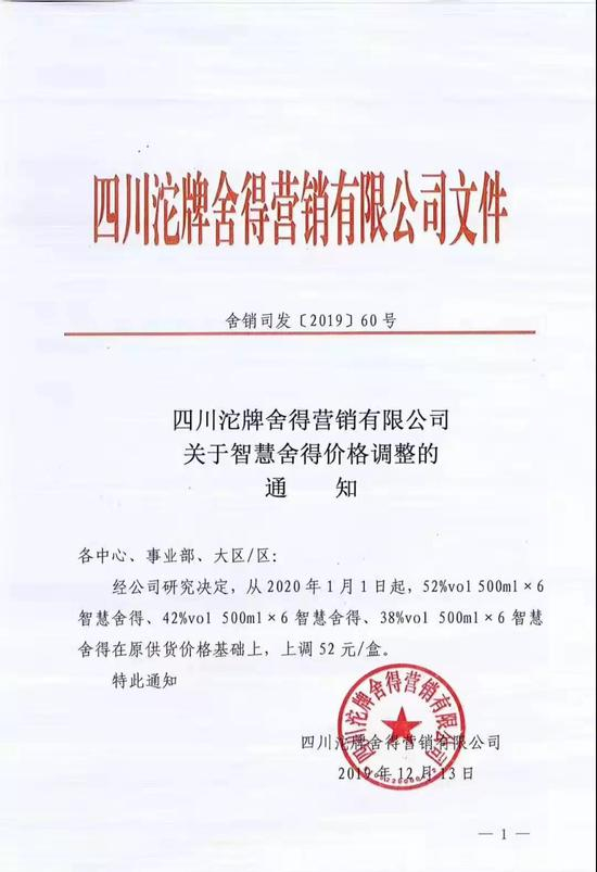 通知显示,从2020年1月1日起,52%vol 500ml×6智慧舍得、42%vol 500ml×6智慧舍得38%vol 500ml×6智慧舍得在原供货价格基础上,上调52元/盒。