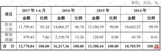 公司的工程施工业务全部采取“包工包料”模式,既“产品+施工”。工程施工业务以防水工程为主,2016年占比87%;2016年公司增加了对维修堵漏市场的开发和投入,承接多个大型维修堵漏项目,促使维修堵漏项目收入大幅增长,占比提升到13%。