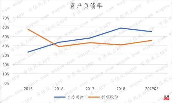 截至2019年三季度末,东方雨虹资产负债率55%,科顺股份46%。