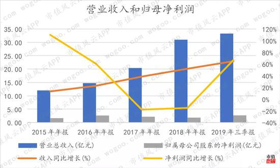 受益于产能释放、客户订单增加和防水施工收入增长,科顺股份的营业收入保持较高的增速,2015-2018年,营业收入从12亿增长到30.97亿,年化复合增长率达37%。2019年前三季度,录得营业收入33.26亿,同比大增65%。