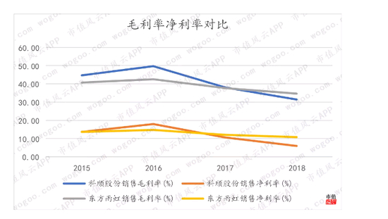 在2015、2016年,科顺股份毛利率、净利率高于东方雨虹。2017年、2018年,沥青等大宗原材料价格上涨,东方雨虹也受到影响,毛利率、净利率下滑,但是降幅显著小于科顺股份。