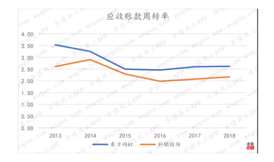 从应收账款周转率上看,科顺股份的表现也逊色于东方雨虹。2013年起,科顺股份周转率始终低于东方雨虹。2018年科顺股份应收账款周转天数增加到137天。