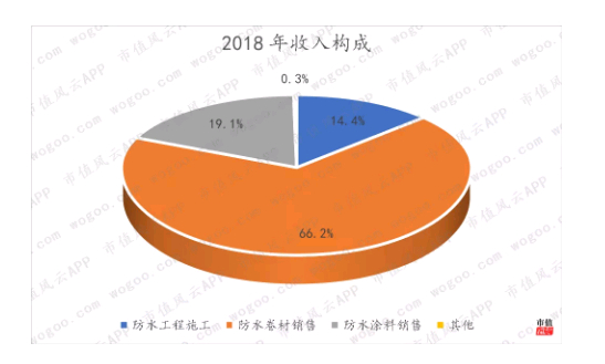 公司主要收入来自销售防水卷材,2018年防水卷材销售额20.44亿,占比66%;防水涂料收入5.88亿,占比19%。防水工程施工对营业收入的贡献逐年增强,占比从2014年的10%增加到2018年的14%。