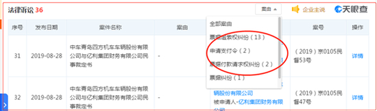 根据天眼显示,亿利集团财务有限公司自今年3月起法律诉讼超过36条,其中大部分以票据追索权纠纷为主。此外,网上有人曝出集团财务公司到期票据不能兑付现象。江苏一家铸造企业负责人曾向网络大V“银角大王的葫芦”爆料,他们有一张今年五月初到期的亿利集团财务票至今仍未兑付。其口中的财务票,指的是由亿利集团财务有限公司(亿利财务)承兑的票据。至于爆料请情况是否属实,新浪财经希望致电进一步了解情况,电话未接通。