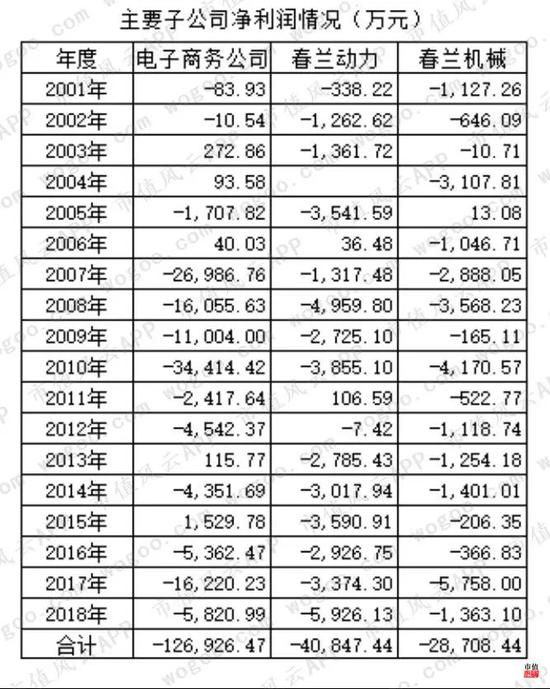 电子商务公司作为上市公司主要的销售控股子公司。在春兰股份众多“特能亏”子公司中,电子商务以累计亏损12.7亿元(2001-2018年)的金额荣膺“亏损状元”,18年间只有5个年小幅盈利。