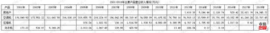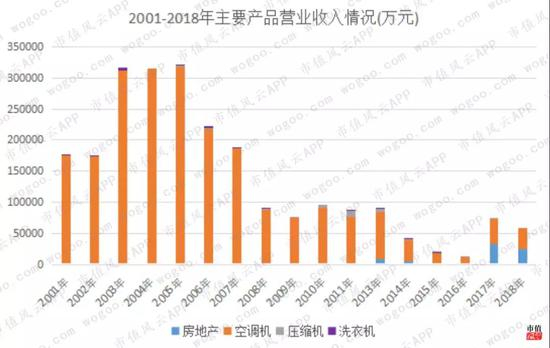 从收入结构看,2001-2015年都是以空调销售为主,结合上表不难看出,其营业收入连续下降,利润则是在保壳线上挣扎。2017-2018年营业收入和净利润稍稍改观,主要原因是房地产业务占营业收入4成以上。