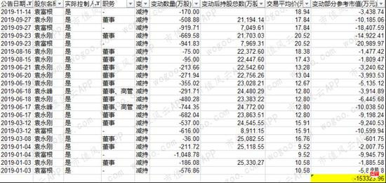 但这个套现规模与最近的规模一比,真可谓小巫见大巫了:进入2019年,袁氏父子三人已合计减持套现了15.33亿元。