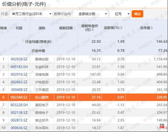 截至2019年12月13日,东山精密的总市值高达348.95亿元。根据申万行业分类,在电子元件制造行业全部41家上市公司中,东山精密的市值排名第6,营业收入和净利润排名第3,也是位列行业前茅。