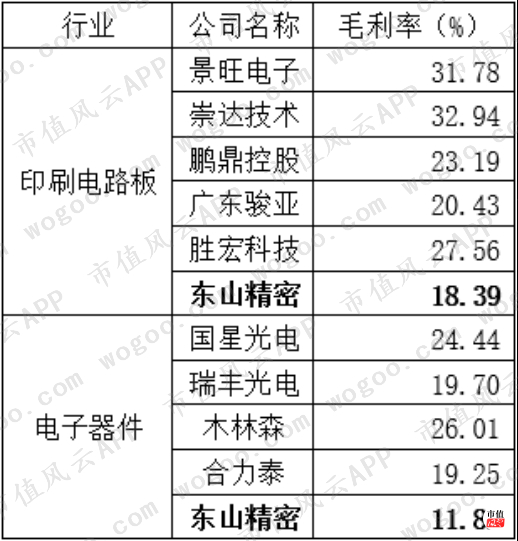 对比的结果是,无论是在印刷电路板行业,还是在电子器件行业,东山精密的毛利率与可比公司之前均存在明显的差距。