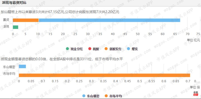 事实也是如此。上市以来,东山精密累计派现只有2.20亿元,分红募资比只有0.03倍,位于市场末末位。