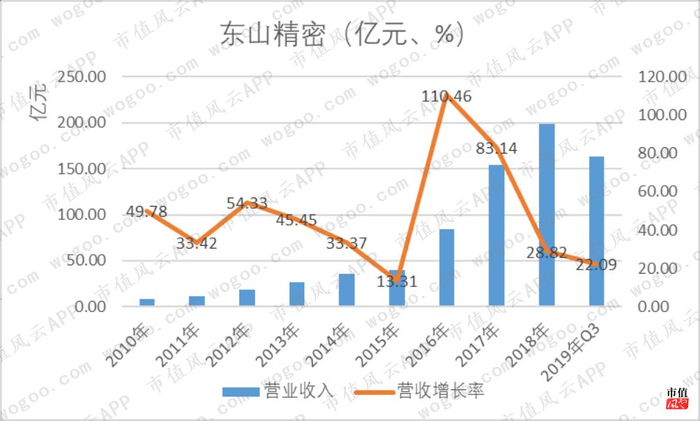 2018年,东山精密实现营业收入198.52亿元,增速虽然开始下滑,但仍高达28.85%;2019年前3季度的营收增速仍保持在20%以上。