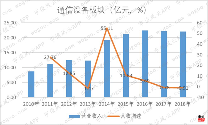 2018年,通信设备板块实现营业收入22.04亿元,占营业总收入的比重仅11.12%,同比下滑了0.91%。