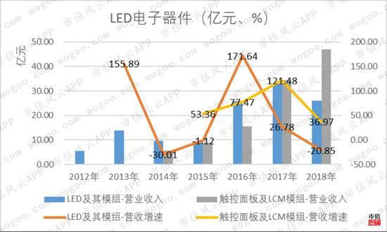 其中,LED及其模组板块是上市公司通过内部新建拓展起来的板块,2012年正式成为营业收入的重要组成部分,在2012-2018年期间的波动较大,复合增长率为30%。