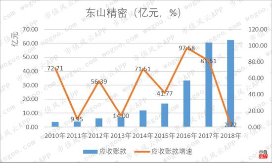 从规模上看,截至2018年末,东山精密的应收账款已增长到60.63亿元,占总资产的比重高达20%,同比增长了2.72%,是自2010年以来增速最低的一年。