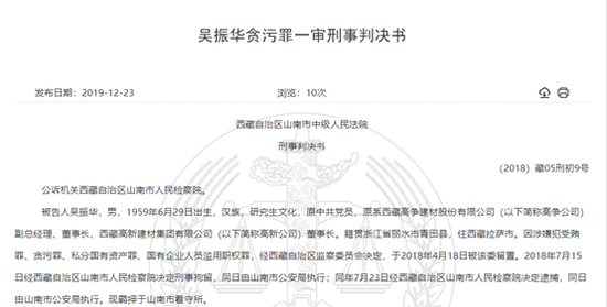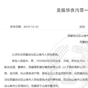 新浪财经讯 近日,裁判文书网公布了西藏天路控股子公司西藏高争建材股份有限公司副总经理、董事长吴振华的判决结果。吴振华于担任高争建材集团董事长期间被查。2018年7月,吴振华被公布因严重违纪违法被双开。最终因受贿390万元,侵吞资产148万,私分国有资产340万元,被判处有期徒刑11年6个月。其受贿来源的主要人物则是自己一手扶持起来的小弟,同时此人还向西藏天路原党委书记唐广顺行贿360万元的行贿人。