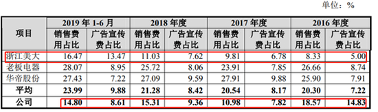 首先从规模上看,2018年浙江美大实现营业收入14.01亿元,是帅丰电器的2.22倍。实现净利润3.78亿元,是帅丰电器的2.14倍。其次,毛利率方面帅丰电器也逊色于浙江美大,2016年、2017年和2019年上半年帅丰电器毛利率均低于浙江美大。另一方面,帅丰电器的销售费用率要高于浙江美大,说明其销售策略更为激进。