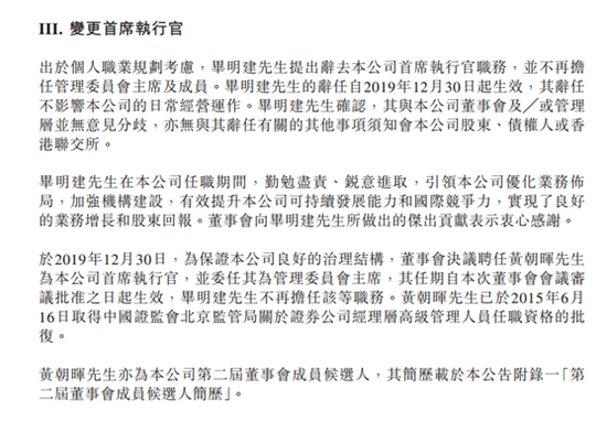 公告中提到,变更首席执行官出于个人职业规划考虑,毕明建先生提出辞去本公司首席执行官职务,并不再担任管理委员会主席及成员。毕明建先生的辞任自2019年12月30日起生效,其辞任不影响本公司的日常经营运作。毕明建先生确认,其与本公司董事会及╱或管理层并无意见分歧,亦无与其辞任有关的其他事项须知会本公司股东、债权人或香港联交所。