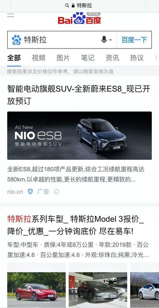 (刚公布降价的那几个小时,搜索特斯拉,会出蔚来的广告,尽管百度已经撤下广告,但这但这慌乱的一幕仍然被相当多的人记录了下来。)