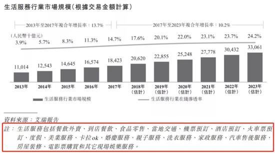 据2018年披露的招股书显示,2017年中国生活服务行业的市场规模为18.4万亿,预计到2023年增长至33.1万亿元,符合增长率达10.2%。
