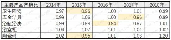 在家居卫浴业务的五类主要产品中,除个别年份外,惠达卫浴2014年~2018年大部分类别产品的产销比都接近甚至超过1,尤其是陶瓷砖产品,2018年销量已超过公司自产与外采之和的五分之一。