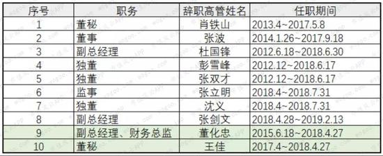 除实控人之一董化忠系退休离任,由前任董秘王佳接替其副总经理、财务总监一职,独立董事彭雪峰、张双才任职期满辞职属于正常人事变动外,原董秘肖铁山在上市后不到2个月即辞职,原副总经理张剑文在任时长未满一年,原独董沈义在2018年6月刚被提名1个月后就申请辞职。