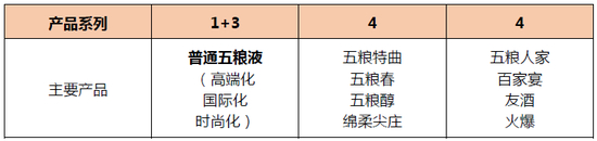 与前些年上百个系列品牌不同的是,公司产品系列瘦身明显,主推“1+3”和“4+4”产品体系。其中,五粮液“1+3”,即普通五粮液以及五粮液的高端化、国际化、时尚化,体现五粮液的纯正和一致性。系列酒“4+4”产品体系,突出打造全国性大单品(绵柔尖庄、五粮特曲、五粮醇、五粮春)和区域性的重点产品(五粮人家、百家宴、友酒、火爆),用于区别和五粮液的等级性。相较于茅台和泸州老窖,五粮液的主要产品线更为复杂一些,品类也更多。