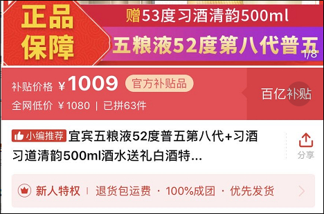 6.拼多多价,拼多多显示全网最低价1080元/瓶,百亿补贴活动后的拼单价格低至1009元/瓶,商家名为第三方昂辉酒类专营店。