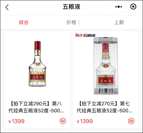 2.官方微信商城价,五粮液微信小程序的第七代、第八代价格为官方指导价1399元/瓶,下单分别立减270、290元,到手价分别为1129、1109元/瓶;