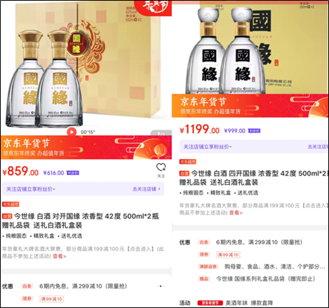 在京东平台上,“今世缘京东自营官方旗舰店”的42度500ml国缘对开标价429.5元/瓶,到手价308元/瓶;42度500ml国缘四开标价599.5元/瓶,到手价499.5元/瓶。