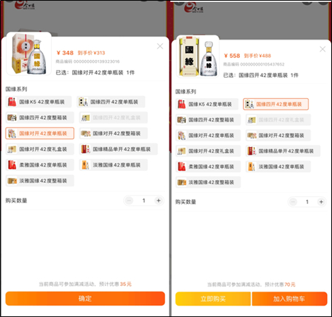 在苏宁易购商城里,“今世缘苏宁自营旗舰店”销量最高,42度500ml国缘对开标价348元/瓶,到手价313元/瓶;而42度500ml国缘四开标价558元/瓶,到手价488元/瓶。