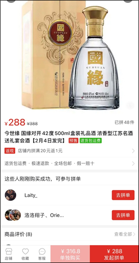 在拼多多上,销量最高的42度500ml国缘对开显示拼单价为288元/瓶,店铺为“醉梦酒类商行”;销量最高的单瓶42度500ml国缘四开拼单价约460元。