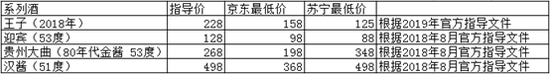 苏宁易购前两款酒售价更低,53度王子酒最低为125元、53度迎宾为88元。80年代53度金酱贵州大曲高于京东为348元,汉酱也高于京东为498元。天猫售价则介于两者之间。