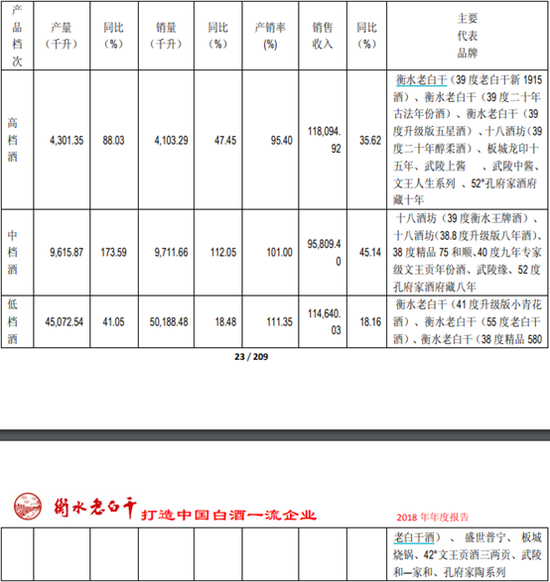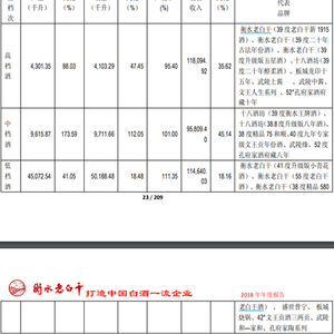 衡水老白干与十八酒坊也划分为众多产品,其中39度1919、39 度二十年古法年份酒、39 度升级版五星酒、十八酒坊39 度二十年醇柔酒属于高档酒;十八酒坊的39 度衡水王牌酒、 十八酒坊38.8 度升级版八年酒属于中档酒;衡水老白干41 度升级版小青花酒、55 度老白干酒、38 度精品580老白干酒属于低档酒。
