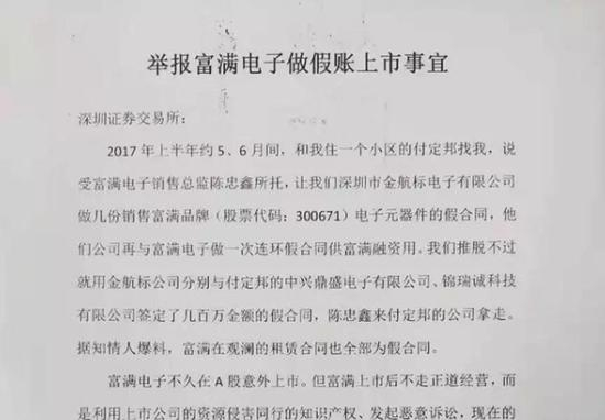 宋仕强在举报信中称,2017年5、6月份,金航标分别与付定邦(与宋仕强同住一小区的邻居)旗下的中芯鼎盛、锦瑞诚签定了几百万元的富满电子电子元器件产品的假销售合同。这些假合同是受富满电子销售总监陈忠鑫委托而签定,并最终被陈忠鑫带走,供“富满融资用”。不久之后,富满电子就在A股上市。此外,据知情人士称,富满电子在观澜的租赁合同也全部为假合同。