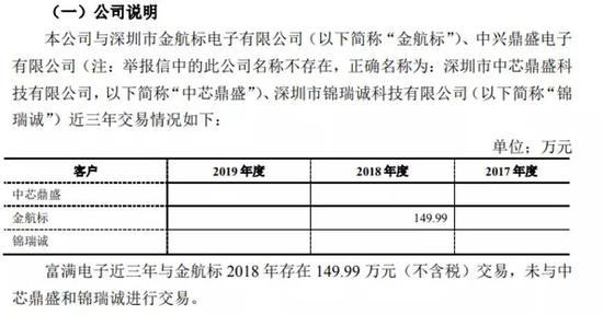 1月16日下午,富满电子回复问询函,称富满电子从 2018 年才开始与金航标合作,近三年仅与金航标在2018年存在149.99万元(不含税)交易,未与中芯鼎盛、锦瑞诚交易。因金航标拖欠货款,富满电子与金航标之间存在诉讼,与中芯鼎盛、锦瑞诚不存在诉讼。公司、控股股东、董监高人员与金航标、中芯鼎盛、锦瑞诚不存在关联关系或其他利益安排。针对宋仕强举报的“富满电子在观澜的租赁合同也全部为假合同”,富满电子罗列了相关租赁合同的租金、租赁期限等信息。
