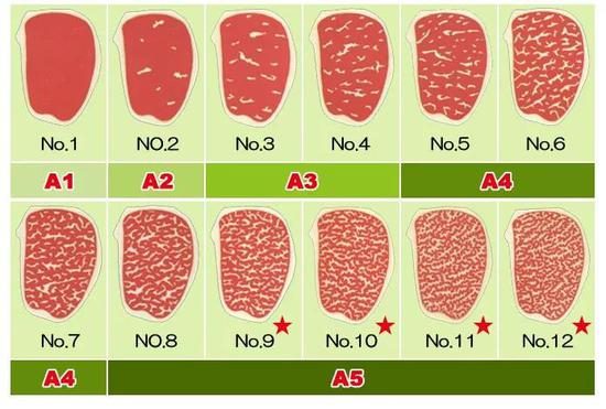 日本的和牛从高到低共分为五个等级,即A5、A4、A3、A2、A1。A3 以上级别的牛肉就可以看见大理石状的分布,其中A5级的和牛是最顶级的。