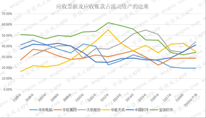 从应收账款占流动资产的比重看,在2014年之前宝信软件的该占比均排在第一,曾达到60%,2017年以来下降明显,目前在35%左右。