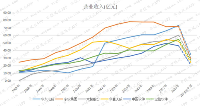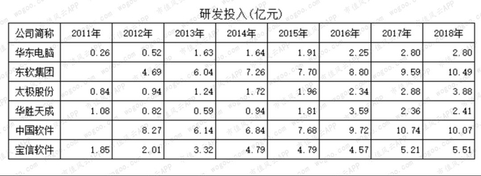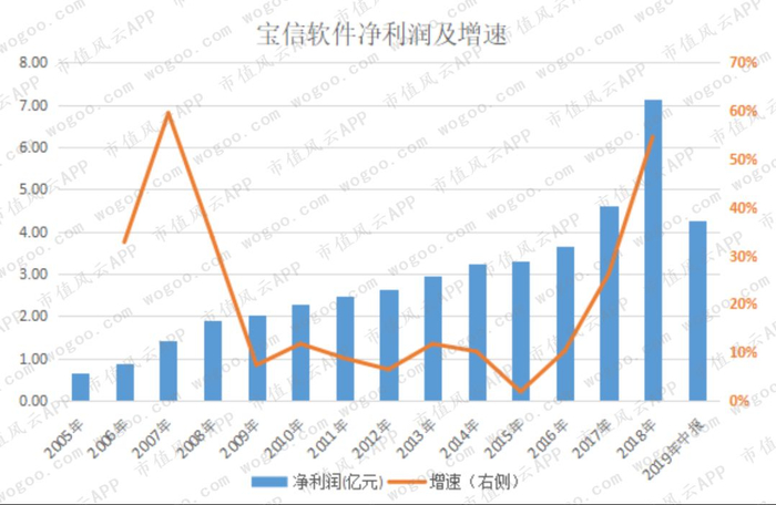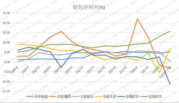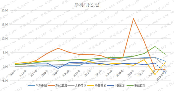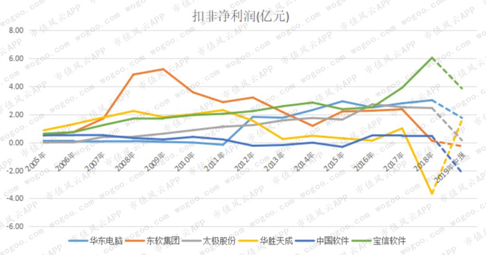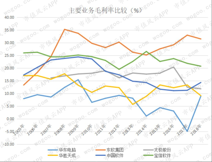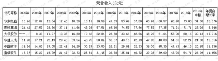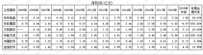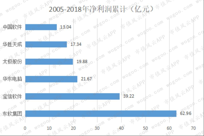 从2005-2018年复合增长率看,排第一,华东电脑的近16%排第二,东软集团以8.6%垫底,宝信软件与中国软件相当,均在11%左右,仅高于东软集团。