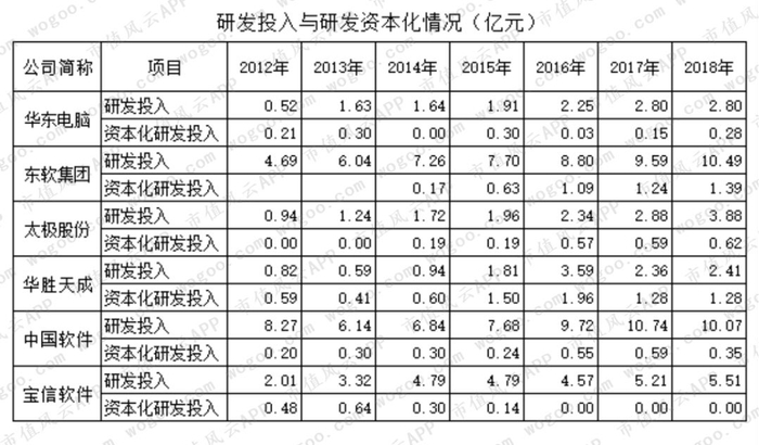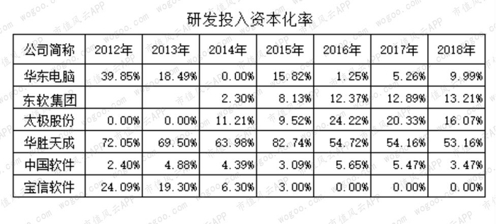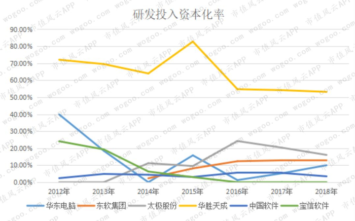 从上图表清晰看出,华胜天成的研发投入资本化率非常高,一度超过80%;另外5家研发投入资本化率较低,其中宝信软件最近3年研发投入资本化为0,即全部费用化。