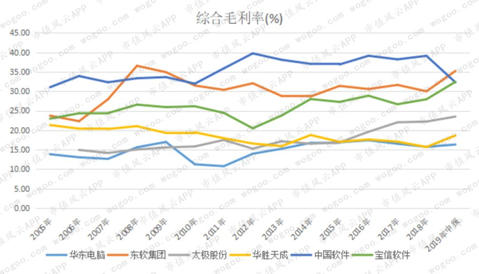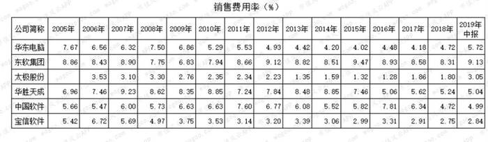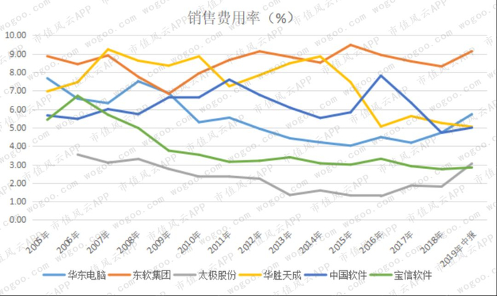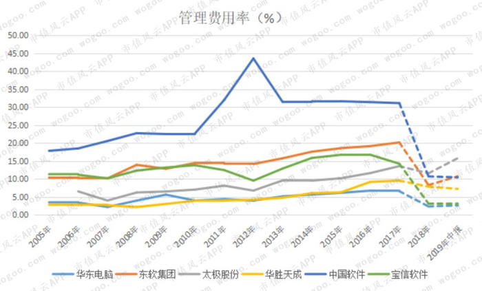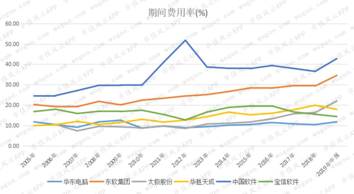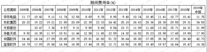 从上方图表可清晰看出,中国软件、东软集团两家公司的期间费用率呈现上升趋势,并且明显高于另外4家公司,中国软件在40%上下,东软集团在2019年中报创新高,接近35%;太极股份的期间费用率也呈现上升趋势;华东电脑的期间费用率最低且长期处于10%上下。