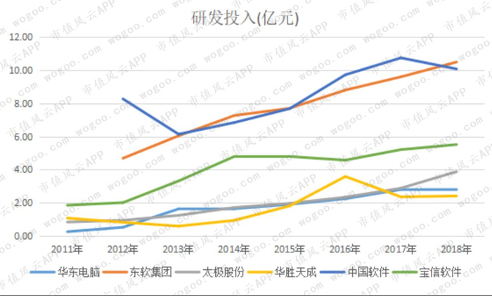 如果用投入金额及占比来衡量对研发的重视程度的话,中国软件、东软集团及宝信软件等3家公司研发投入较高、占比也较高,3家公司相对更重视研发。