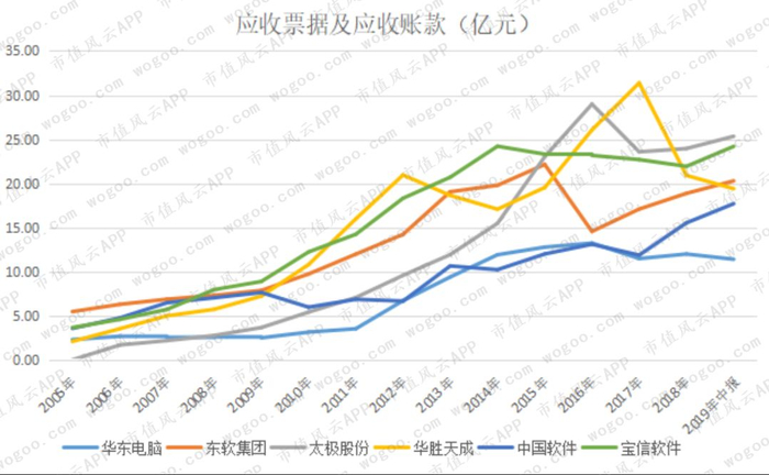 从上图表清晰看出,宝信软件、华胜天成、太极股份等公司的应收账款金额较高,其中宝信软件长期处于第一或第二位置。