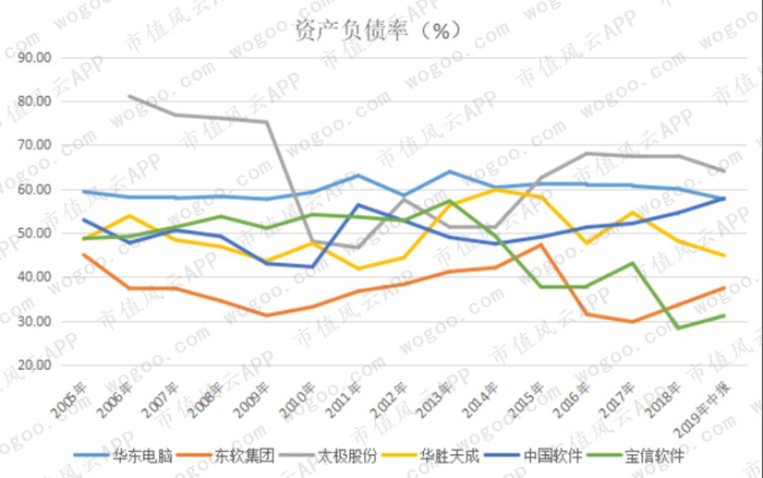 6家公司的资产负债率比较分散,以2018年数据,从28%到67%,宝信软件相对偏低。