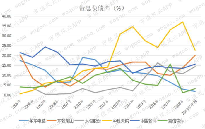 为了更清晰分析宝信软件的非经营性负债在6家公司中的水平,需要比较带息负债率情况。