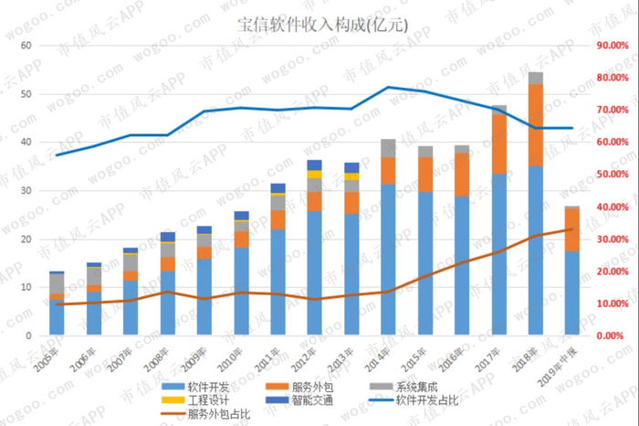 在宝信软件的收入结构中软件开发及工程服务占比很高,基本保持在60%以上;此外,服务外包业务收入及占比保持逐年增长态势,收入规模从2005年的1.28亿元,占比9.6%,增长到2018年近17亿元,占比达31%。